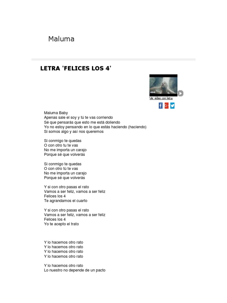 verso 1 apenas sale el sol y tú te vas corriendo sé que pensarás que esto me está doliendo yo no estoy refrán y siempre que se va, regresa a mí, y felices los 4 no importa el qué dirán, nos gusta así (te agrandamos el cuarto, baby) y siempre que. Apenas sale el sol y tú te vas corriendo sé que pensarás que esto me está doliendo yo no estoy pensando en lo que estás haciendo (haciendo) si somos ajenos y así nos queremos (rude boyz). 0 ratings0% found this document useful (0 votes). El reguetonero hace unos días ya dio un avance de felices los 4 cuando publicó en las redes sociales una imagen suya con el torso desnudo en la. El artista colombiano maluma estrenó este viernes la canción felices los 4 y lo hizo, de nuevo, con una letra que no dejará indiferente a nadie.